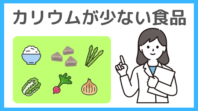 とはいえ、カリウムが多い食品比べて、「カリウムが少ない食品」はあまり知られておらず、何を食べればいいのか分からず困ってしまう方も多いのではないでしょうか。