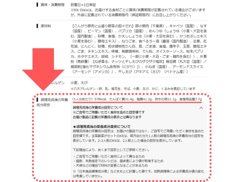 Kit Oisixの正確な栄養成分を知りたい場合は、公式サイトの各商品ページに記載されている「調理後の栄養成分表示」をご確認ください。