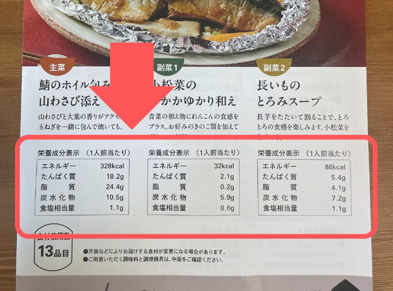 ヘルスケアOisixの栄養価は、ヘルスケアだけあって、キットに同封されているレシピに、調理後・1人前あたりの栄養価が料理ごとに記載されています。